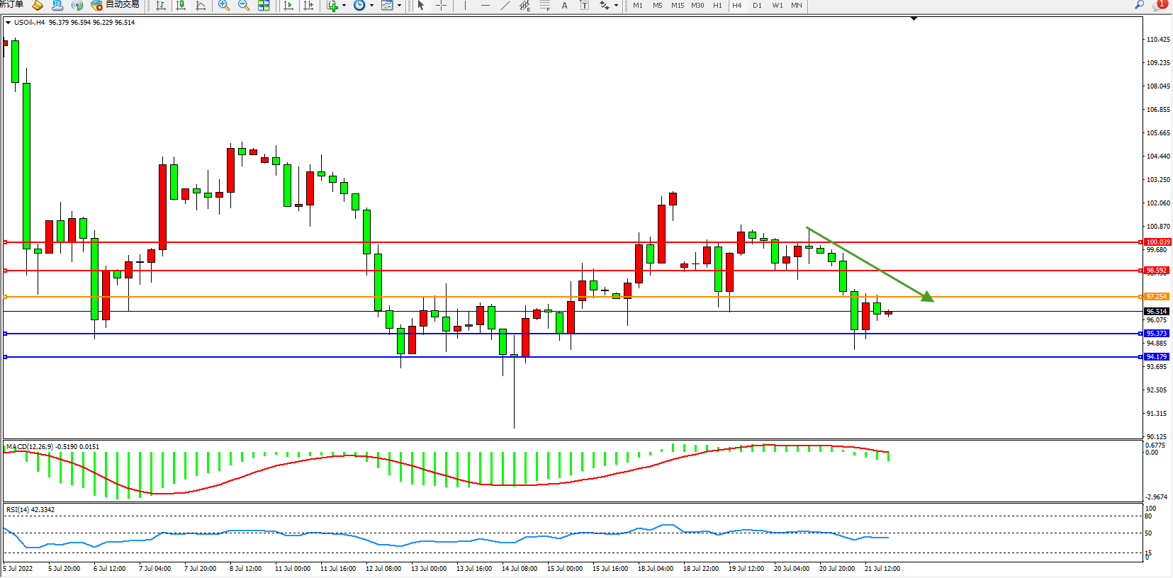 原油维持96.514附近震荡,美联储大幅收紧政策将挤压市场流动性,导致经济陷入衰退,进而损害原油需求,这在近几周持续给油价带来压力。