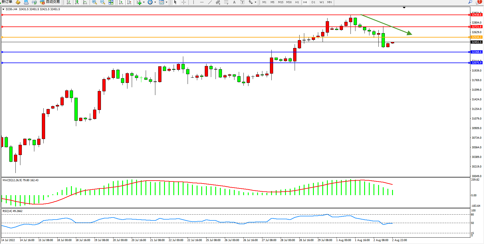 道琼斯指数8月2日(周二)收盘下跌401.64点,跌幅1.22%,报32396.76点;美国国债收益率飙升,因为政策制定者表示他们还没有结束对抗通胀的努力,这促使交易员减少了对明年降息的押注。