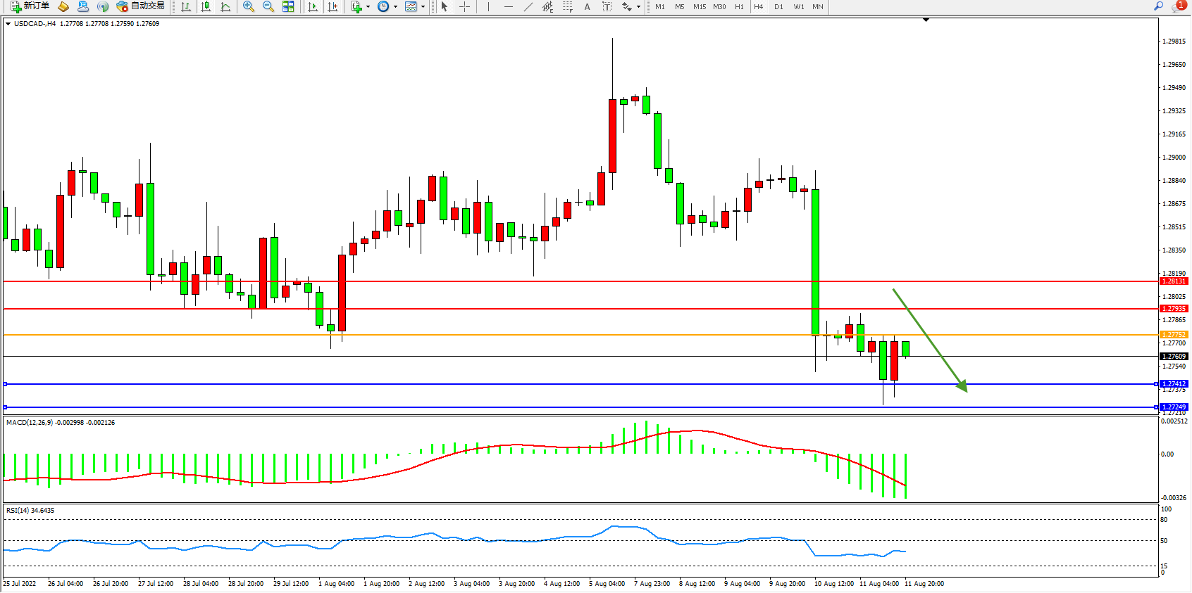 美元加元USDCAD——4小时K线图显示: