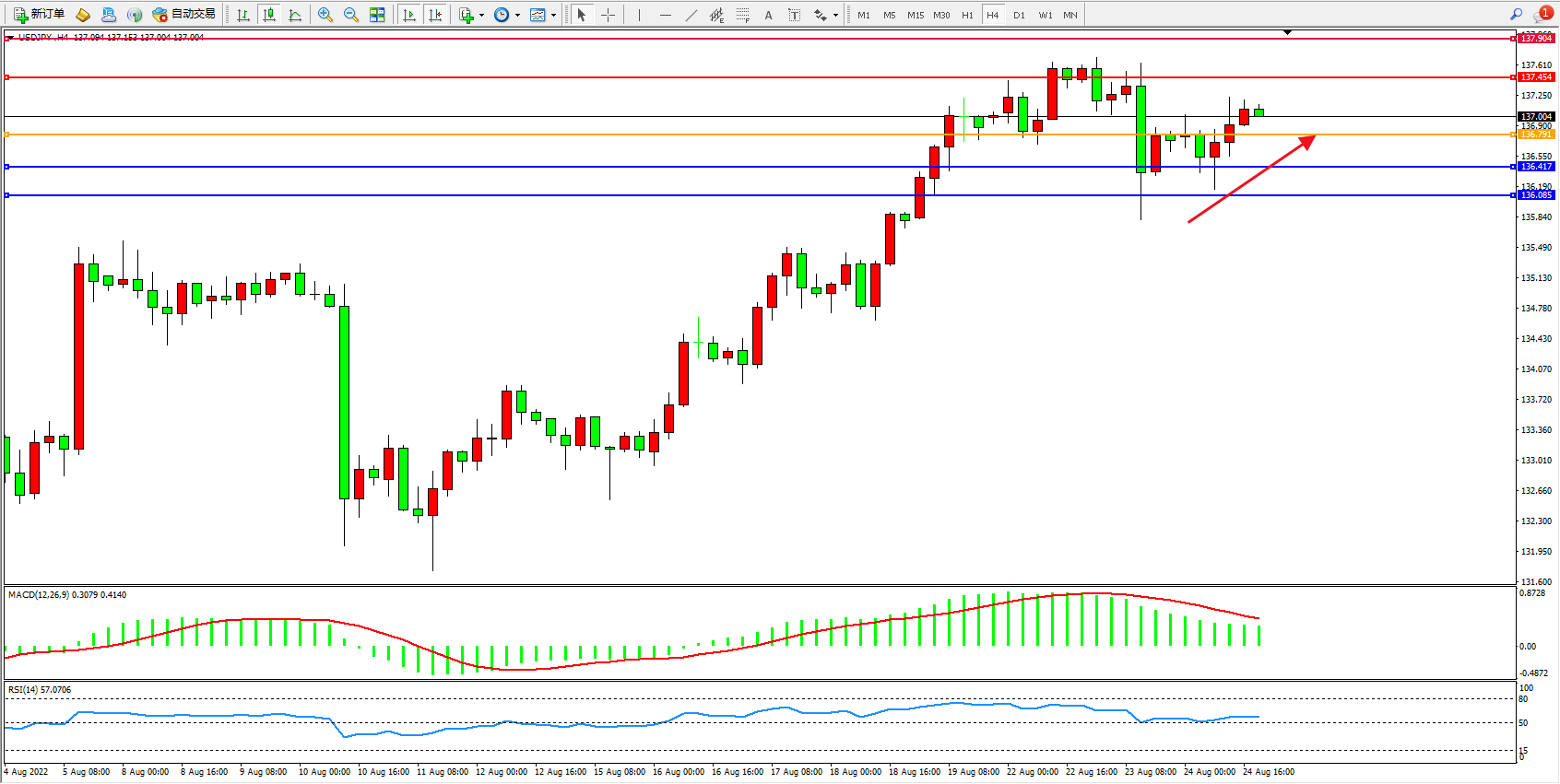 4小时图看:高位短期宽幅震荡,市场多头动力依旧,短期或维持高位区间震荡,MACD指标处于多头区域维持整理平移,RSI指标处于50均衡线上側弱势徘徊;