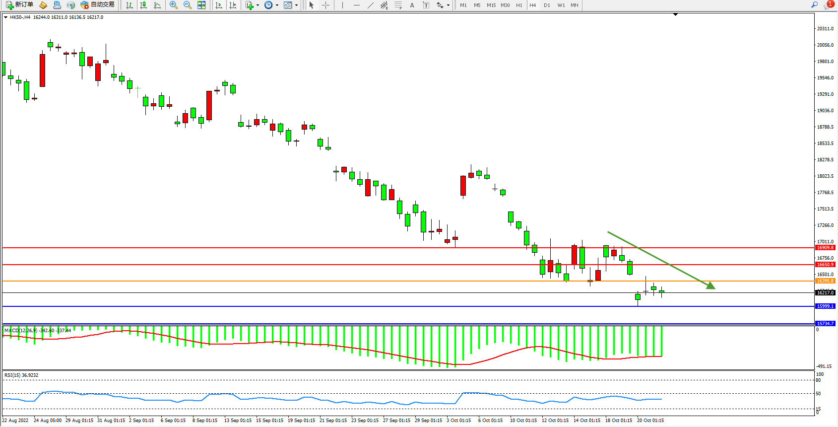 香港恒生指数10月21日(周五)收盘下跌69.1点,跌幅0.42%,报16211.12点;港股全天呈窄幅震荡行情,连续大跌的三大指数盘中反复飘红有止跌迹象。恒生科技指数跌0.62%。大型科技股走势分化,小米涨1.54%,京东、美团、腾讯小幅上涨,证监会允许特定房企在A股融资,大基建股走俏,内房股集体反弹。