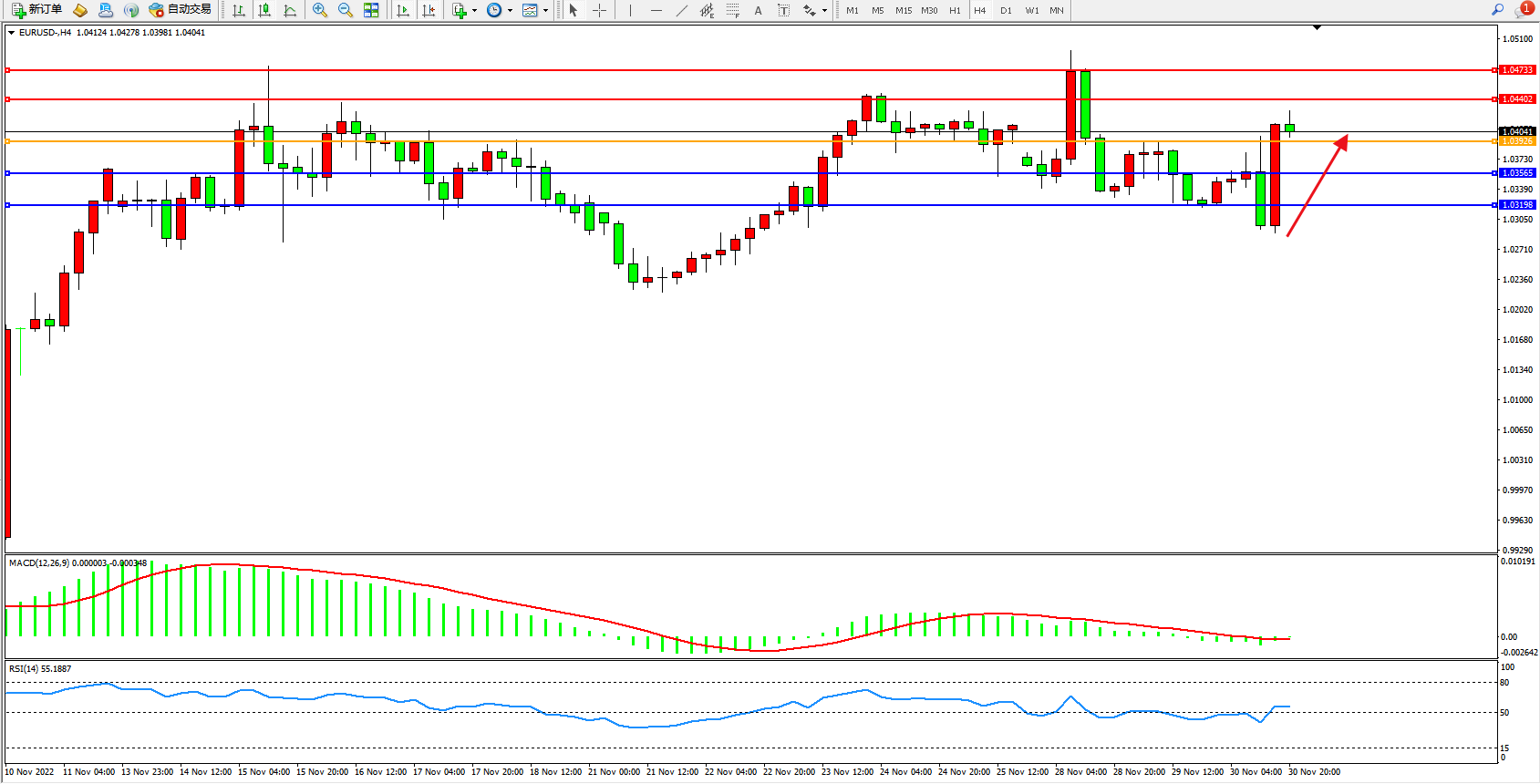 欧元美元EURUSD—4小时K线图显示: