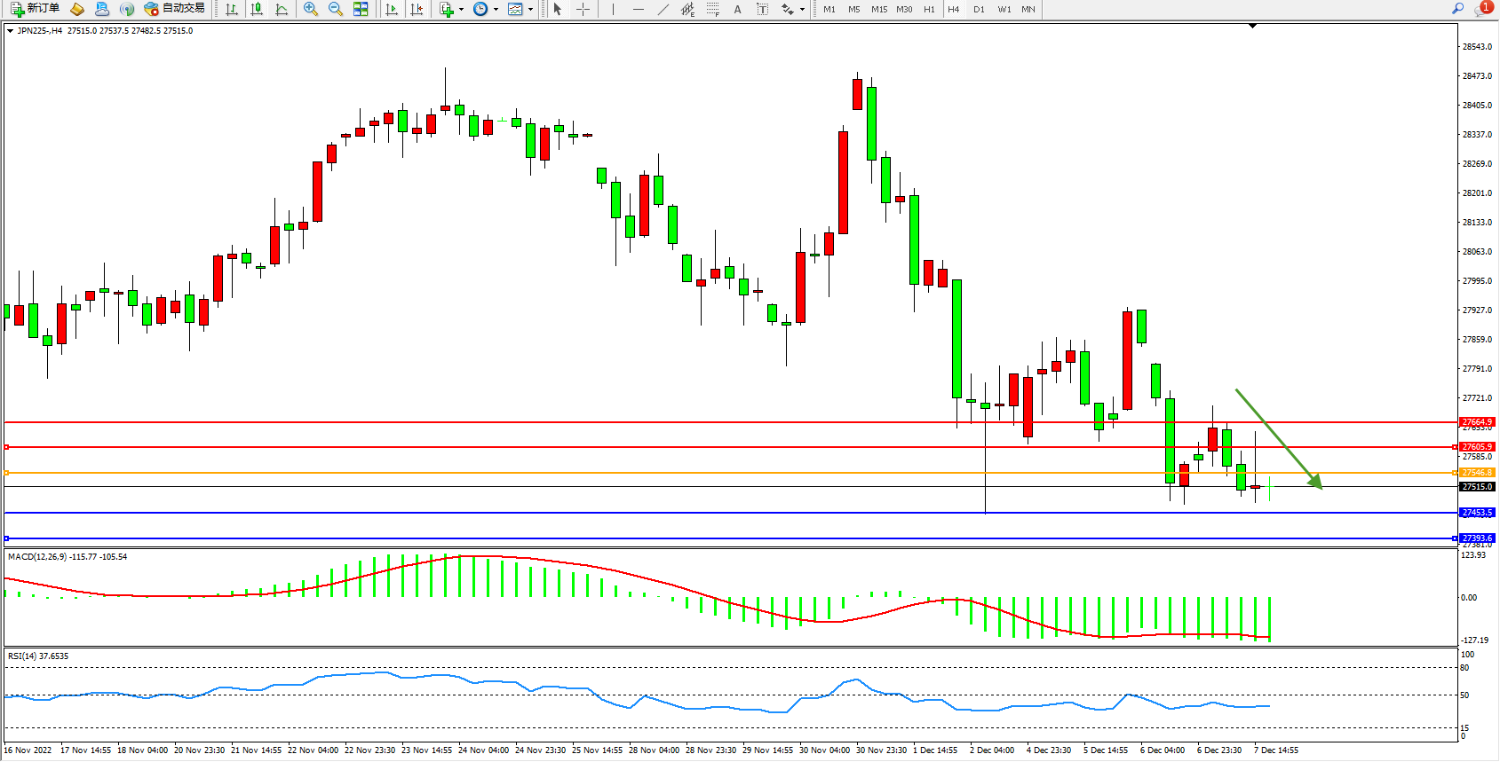 4小时图看:低位空头动力窄幅震荡,短期有迹象震荡下行迹象,市场整体处于低位整理,MACD指标处于空头区域低位徘徊,RSI指标处于50均衡线下侧整理;