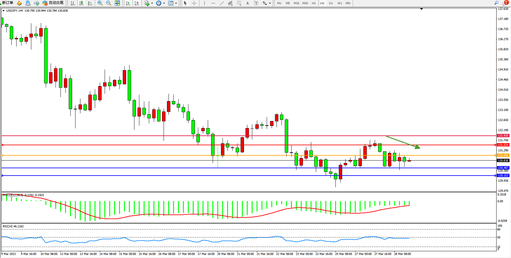 交易策略:131.058下方看跌,目标131.524  131.930