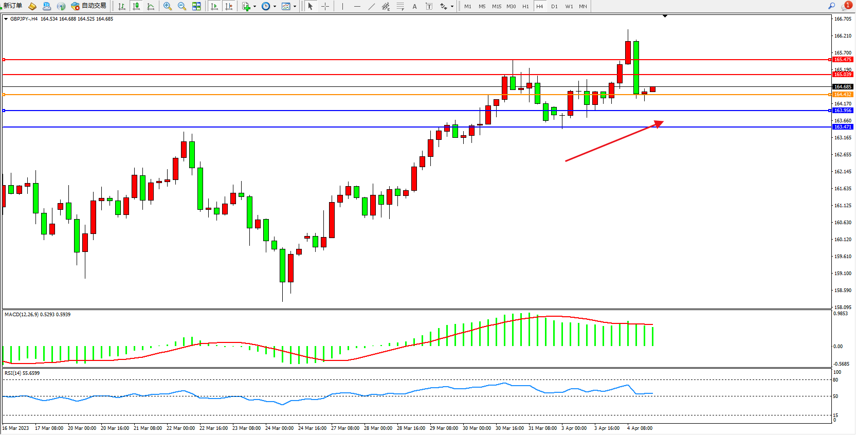 交易策略:164.432上方看涨,目标165.039  165.475