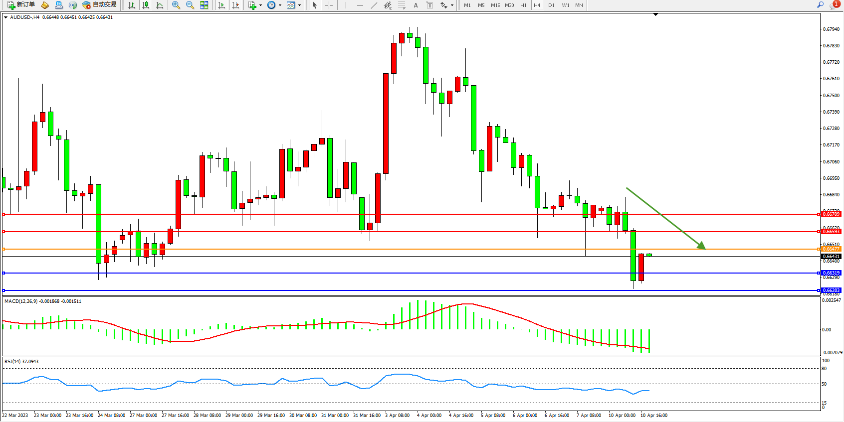 澳元美元AUDUSD——4小时K线图显示:
