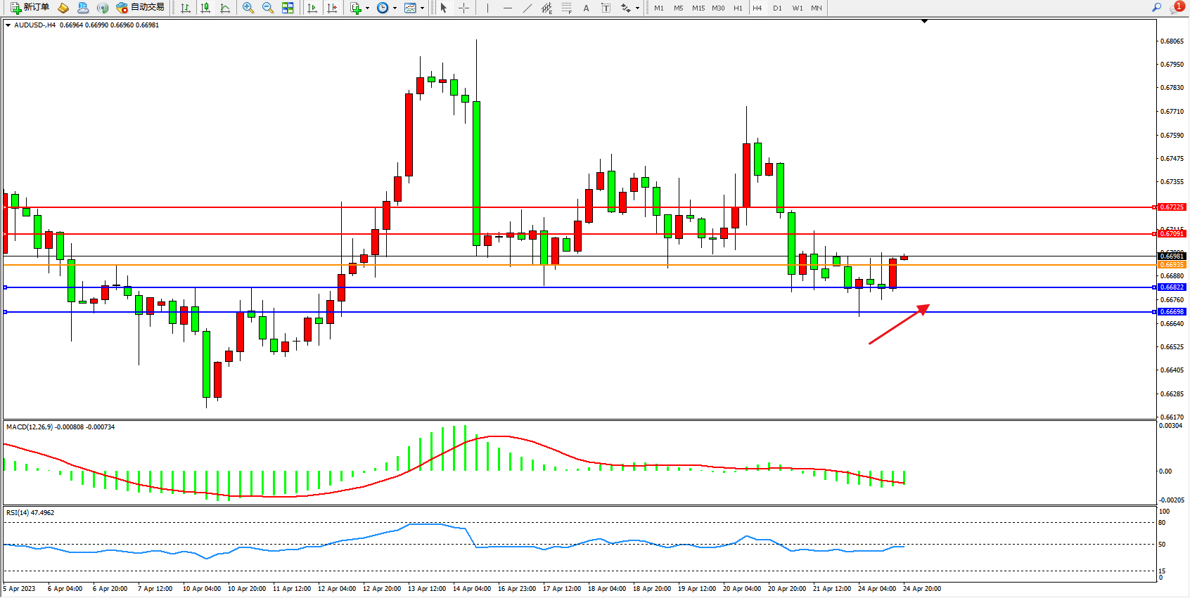 澳元兑美元维持0.66981附近震荡,利率和通胀前景存在一系列不确定性,澳洲央行将需要在未来几个月恢复加息,使通胀保持在一个充分的下行轨道上。预计7月和8月将分别加息25个基点,这与市场预期形成鲜明对比,市场认为再加息几率只有50%。