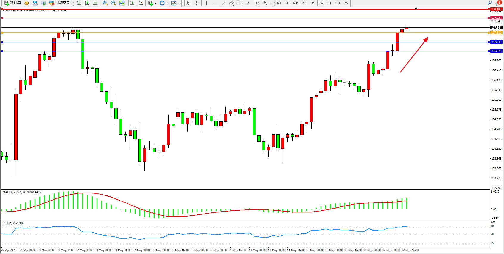美元兑日圆维持137.664附近震荡,日本经济增长高于预期,防疫规定进一步放松提振了消费,积极的经济表现或让提前大选和央行调整政策的猜测持续升温。消费和商业数据强于预期,是第一季度经济增长的主要驱动因素,而贸易活动拖累整体数据表现。