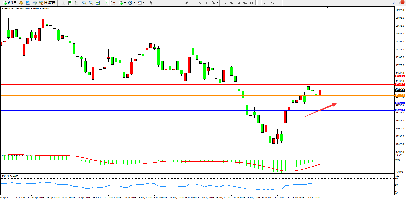 4小时图看:多头动力震荡上移后维持整理,市场看涨情绪逐渐减弱,短期或维持窄幅整理走势,MACD指标处于空头区域震荡持续上行,RSI指标处于50均衡线上側弱势徘徊;