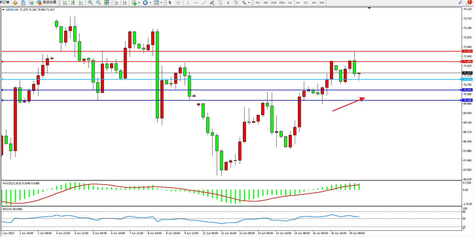 4小时图看:多头动力维持震荡上扬,短期高位遇阻震荡,市场多头动力开始减弱,但上行趋势或将延续,MACD指标处于多头区域维持整理,RSI指标处于50均衡线上側弱势徘徊;