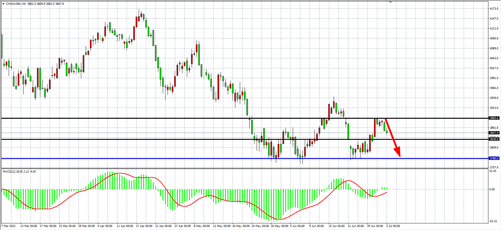 4小时图看,沪深300在3885附近受阻回落,MACD量能在零轴上缩量,趋势总体偏弱,在3885之下短期看跌为主,下方支撑关注3830-3780。