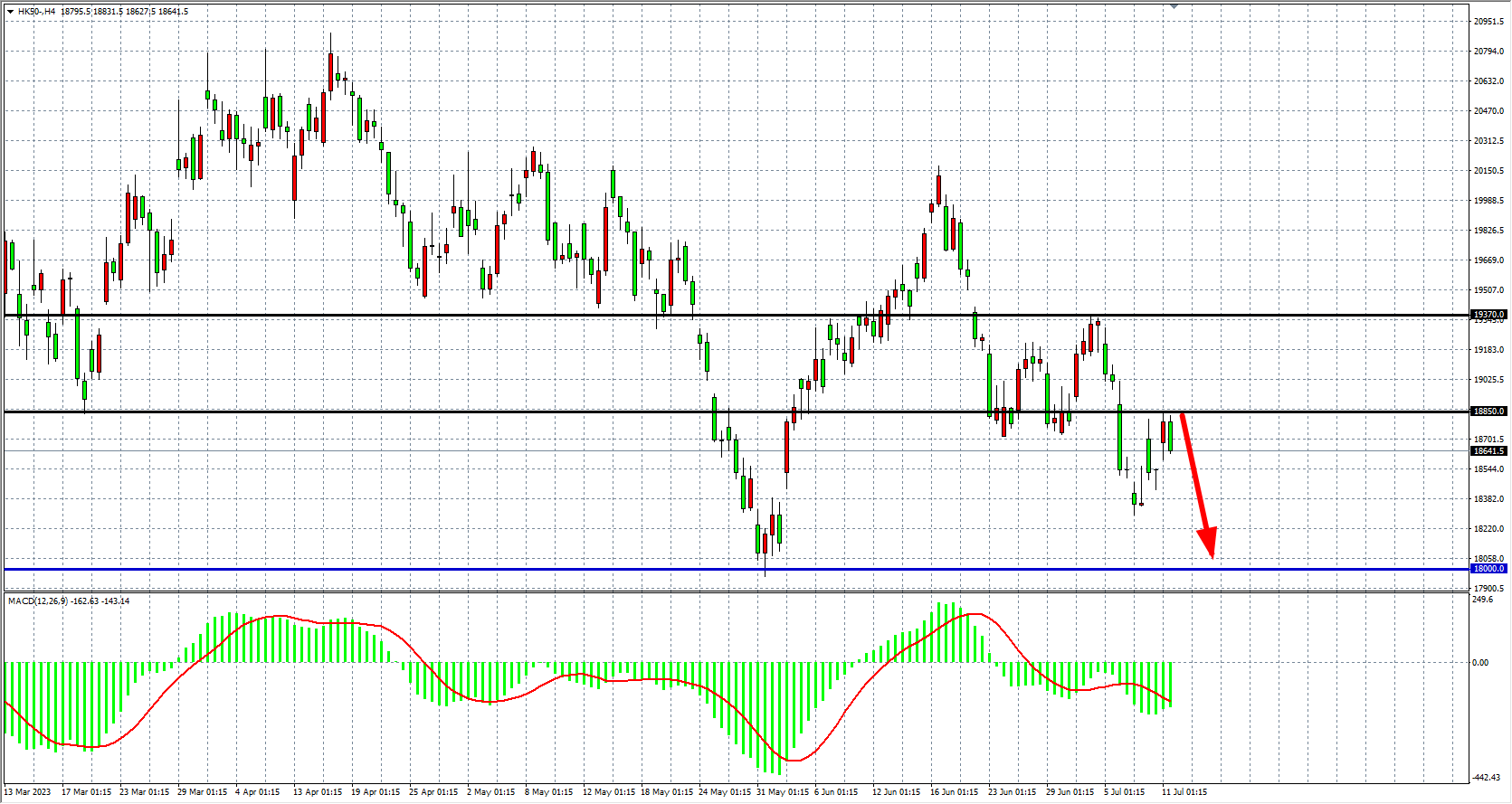 4小時圖看,恆指反彈18850後再度受阻回落,MACD量能零軸下有所縮量,趨勢雖有反彈但力度不足,阻力關注18850附近,該位下繼續看跌18300-18000。