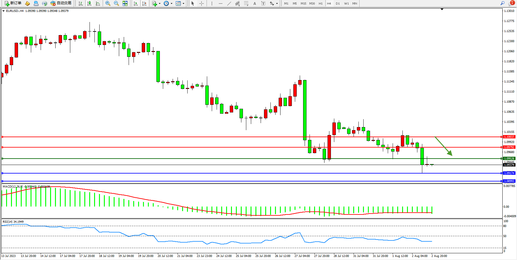 欧元美元EURUSD—4小时K线图显示: