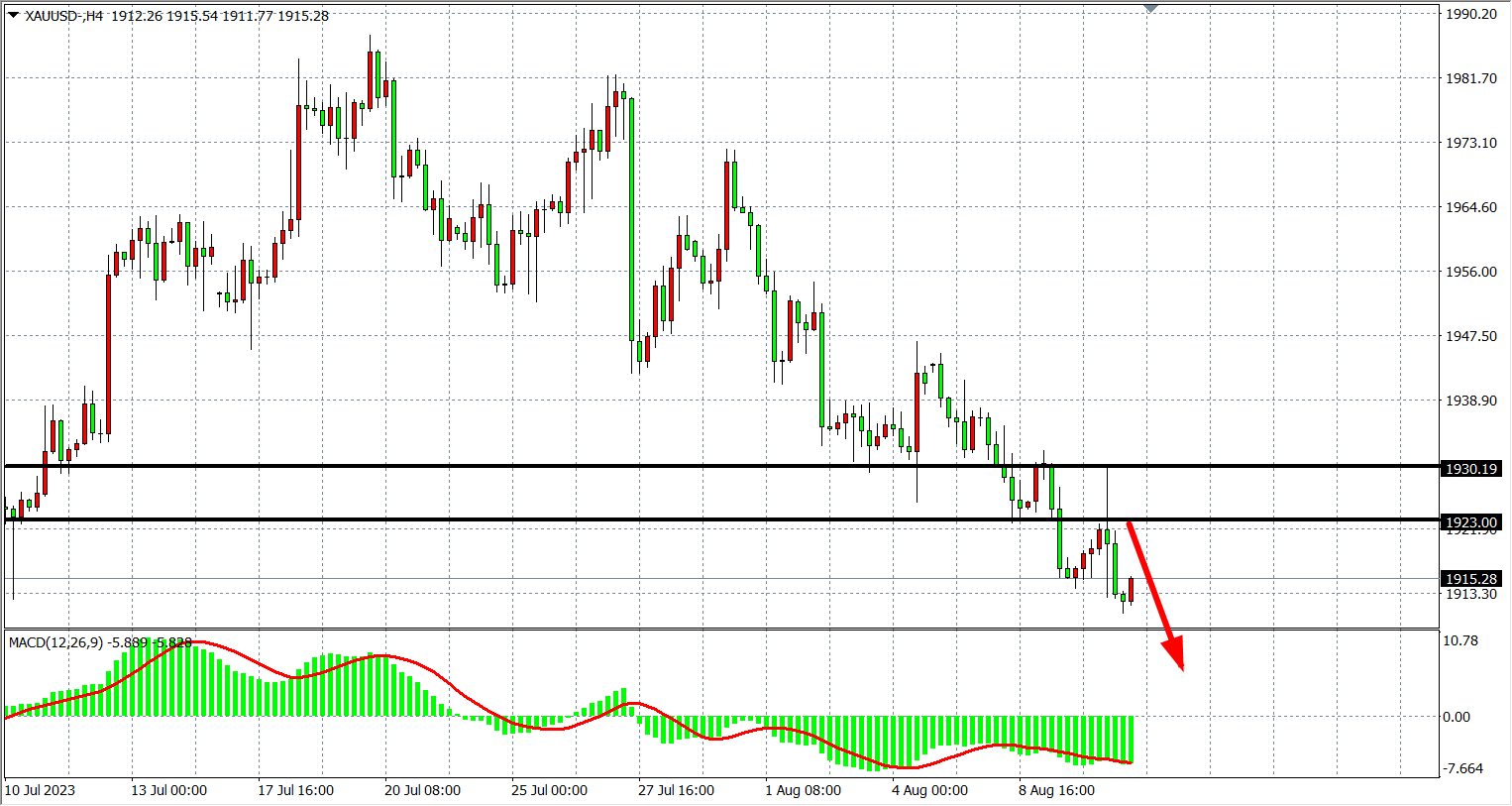 4小时图看,黄金维持在1920下方,MACD量能维持零轴下,走势延续空头行情,阻力继续关注1923-1930附近,支撑关注1900关口。