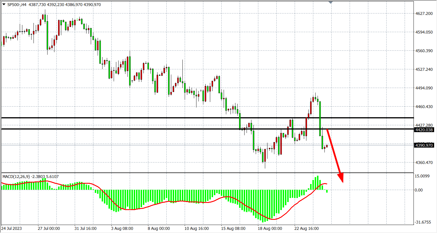 4小时图看,标普在4480一线受阻后再度回落跌至4400附近,MACD量能再度下穿零轴下,行情走势转空,阻力关注4420-4440附近,下方支撑4350-4305。