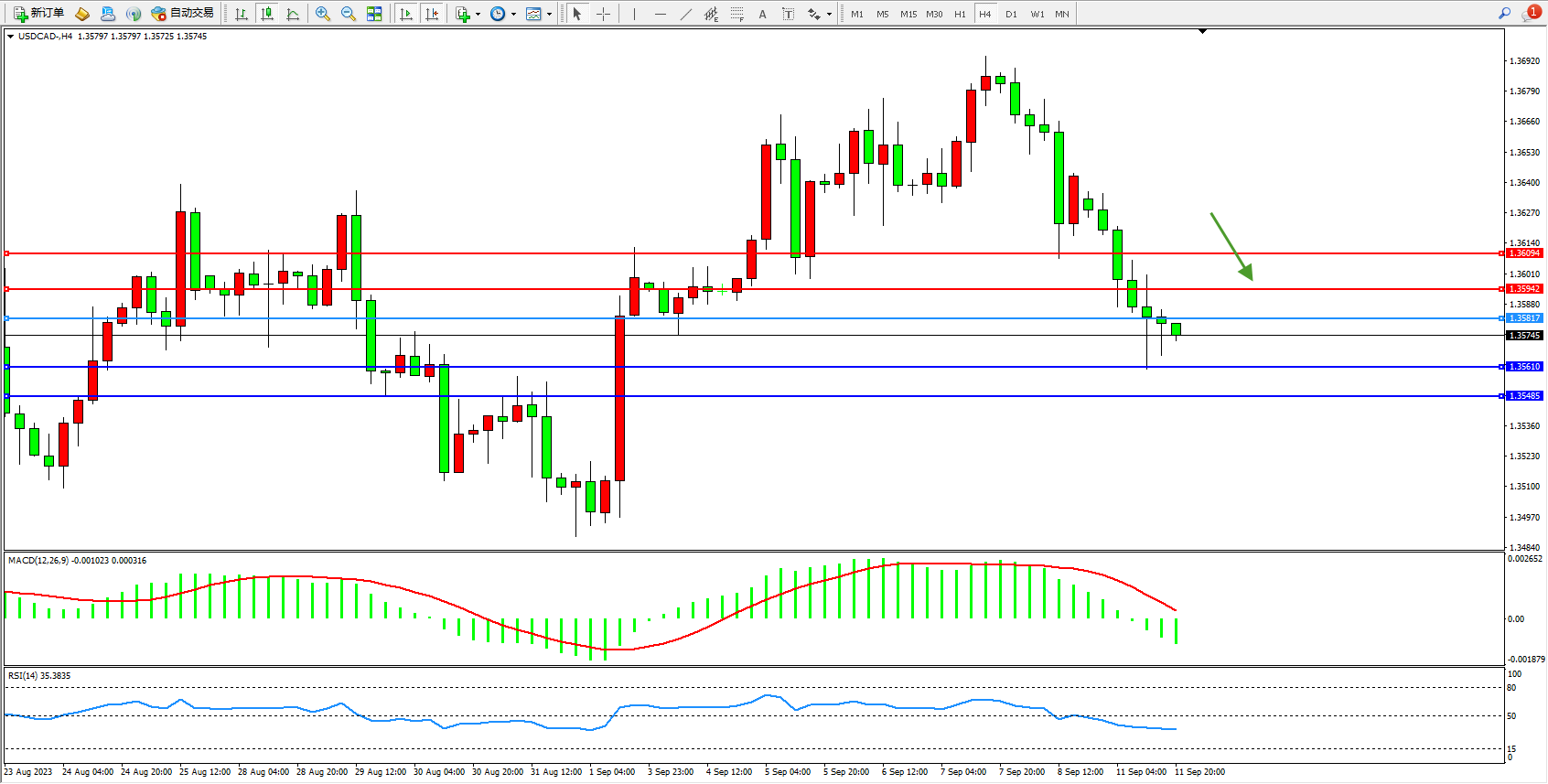 美元加元USDCAD——4小时K线图显示: