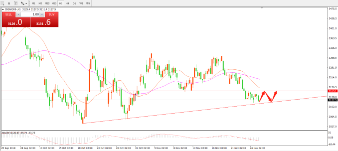 11月27日, 两市小幅高开,开盘之后随即回落,资金出逃意愿增强,整体来看,市场处于存量资金博弈。成交额显著缩小,午后两市集体下挫。截止收盘前CHINA300报价3125,当日下跌跌13个点。