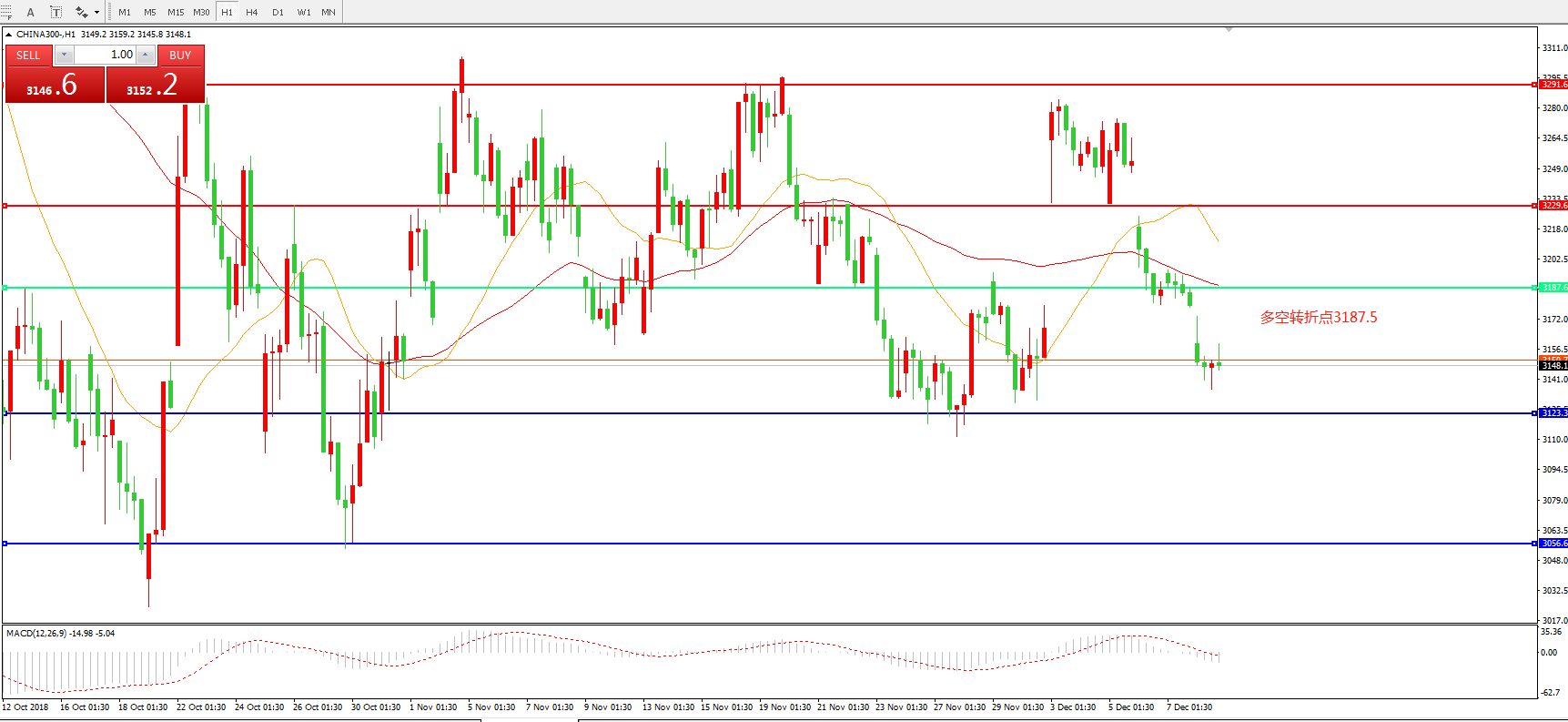 1小时图看,CHINA300中华指数持续下行,整体价位跌至均线系统之下,均线逐渐粘合,MACD红柱增加,日内走势以弱势震荡为主。
