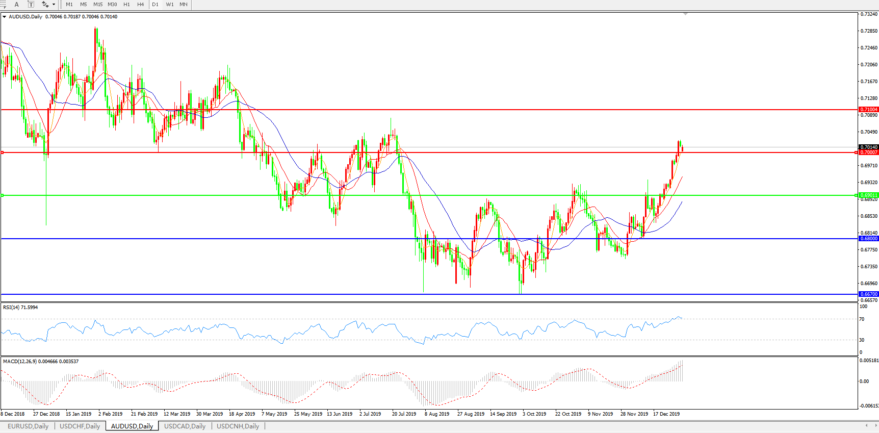 技术面简析:日图均线整体呈多头排列,汇价站上0.70关口并维持偏强整理,MACD继续上攻且量能快速放量,RSI进入超卖区域小幅走弱,短线关注0.70关口的争夺,预计汇价大概率将进一步走高。