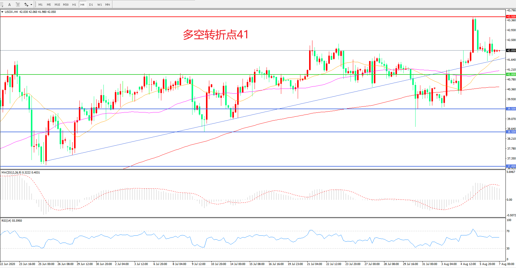 周四(8月6日),尽管美元走疲及EIA原油库存降幅超预期为油价提供支撑,但疫情冲击燃料需求复苏仍在客观上限制油价的上行空间,美国WTI原油延续高位震荡,收报42.02美元/桶。
