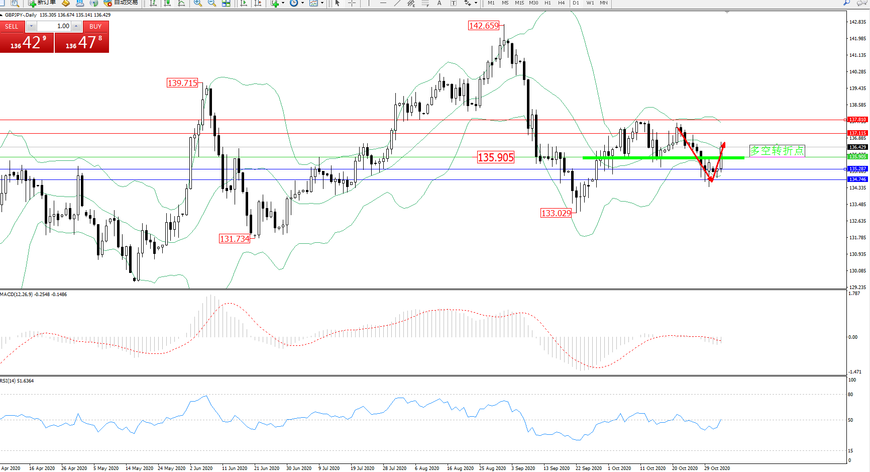 交易策略:135.905上方看涨,目标137.115、137.810