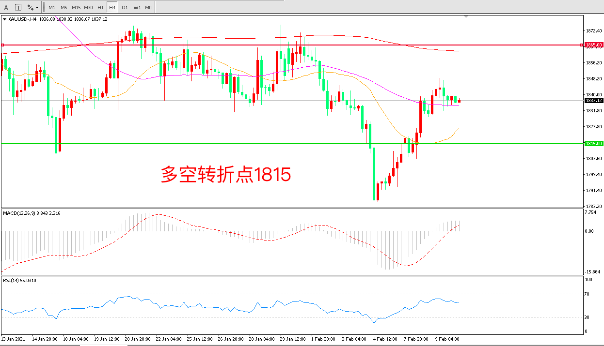 4小时图看,金价阳线连续拉升,短期走势有所回暖,1815一线被突破, MACD绿柱缩短,RSI指标向上,日内延续上行概率较大。