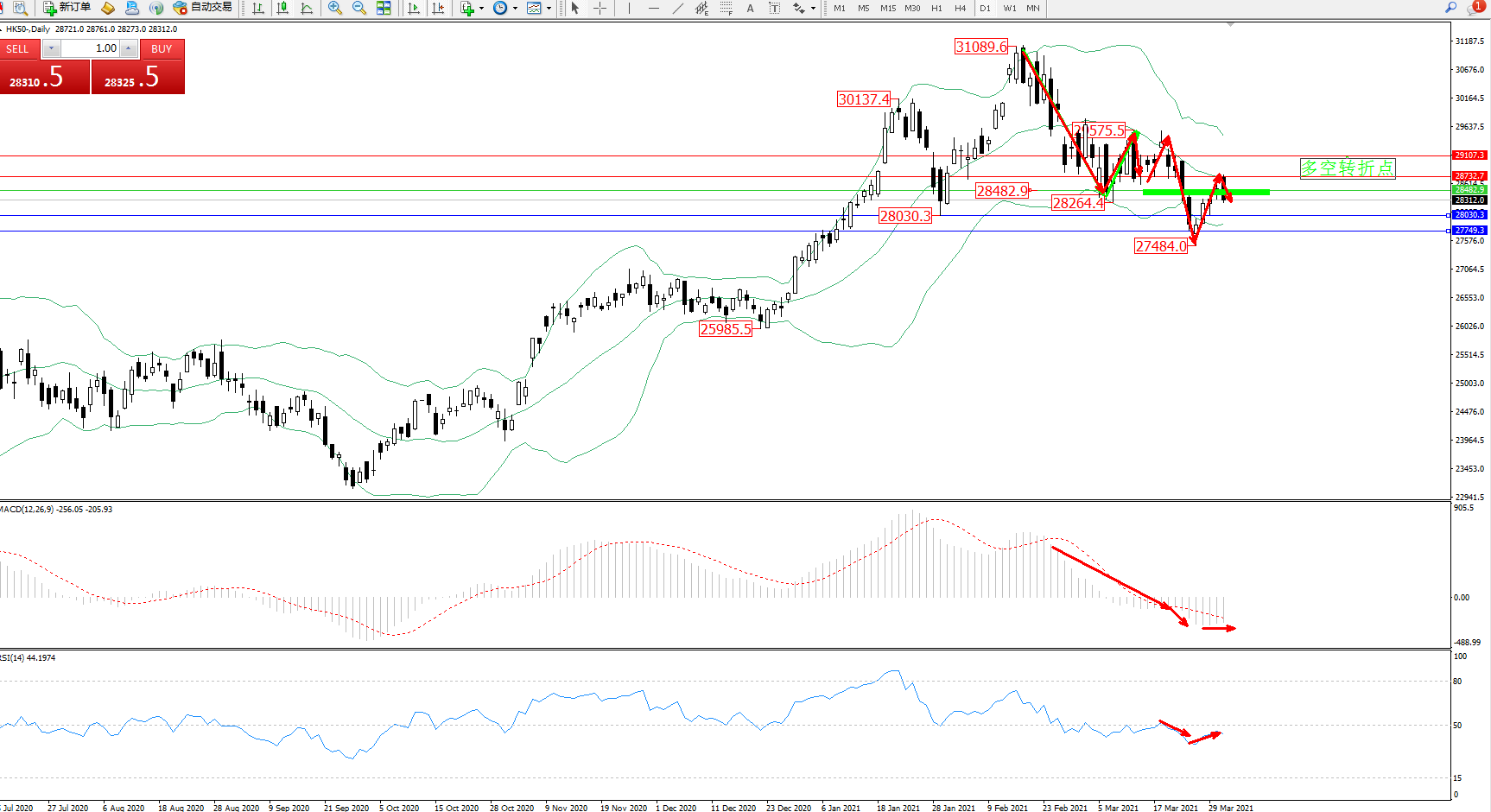 技术点评:空头动力延续布林带指标通道中下轨区间持续震荡向下移动,低位触及27484位置后开始反转上移,触及中轨附近再度遇阻反转下行,空头下行趋势尚未有最终结束态势,布林带指标呈下行趋势走势持续中,关注中下轨区间节点,MACD指标处于0轴线下方空头区域维持整理平移中,RSI指标处于50均衡线下方弱势徘徊中;