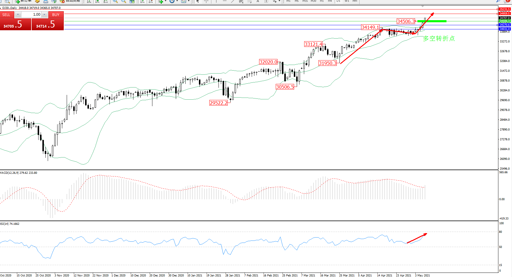 道琼斯指数5月7日(周五)收盘上涨228.90点,涨幅0.66%,报34777.43点;美股三大指数全部收涨升至历史新高,道指持续飙升,4月美国新增就业仅26.6万人,远低于预期的100万。意外疲软的就业数据缓解了人们对通货膨胀率上升和刺激力度可能减小的担忧。疲弱的数据促使投资者涌入受益于疫情的股票,这个数据可能有助于拜登推销其总值6万亿美元的经济刺激方案,也给了美联储维持宽松立场的依据。美国财长耶伦表示,就业报告凸显出复苏的道路将是漫长的,但是她维持今年恢复充分就业的预期。如果就业增长保持这种缓慢步调,美联储加息时间可能晚于市场预期。