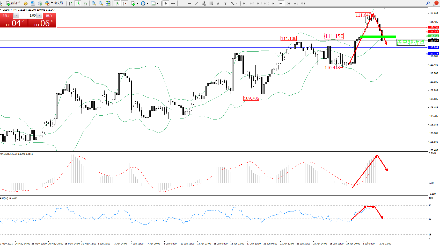 技术点评:多头动力延续布林带指标上轨附近持续震荡上扬后,高位抵达111.647位置遇阻急速下挫,触及布林带指标中轨附近节点后开始震荡,布林带指标呈收口走势持续中,MACD指标处于多头区域不断上扬后高位出现回撤下移走势,RSI指标处于多头区域高位震荡平移后急速下挫,触及50均衡线附近徘徊中;