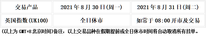 因应2021年8月30日为英国市场假期,本公司以下产品的交易时间将于假期期间作以下安排,敬请留意。