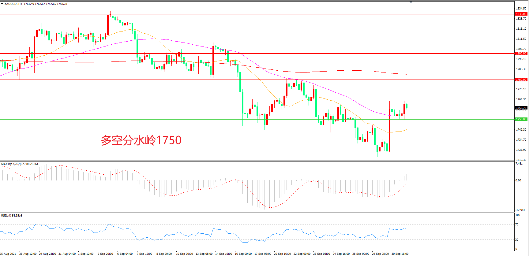 4小时图看,金价长阳拉升,短线走势有所回暖,1750成为多空分水岭,MACD红柱增加,RSI指标走平,日内震荡上行概率较大。