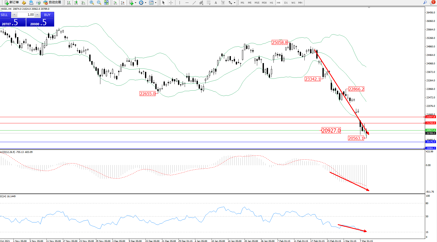 香港恒生指数3月8日(周二)收盘下跌291.76点,跌幅1.39%,报20765.87点;第三轮俄乌谈判无实质结果,全球金融市场继续大跌,美国考虑制裁俄罗斯能源产品。恒生科技指数跌3.21%再度刷新历史低价,录得5连跌。今日南下资金逆势净流入30.14亿港元,大市成交额为1707亿港元。市场消息称,俄乌谈判俄罗斯代表团团长梅津斯基表示,开通人道主义走廊的目的是使乌克兰武装力量控制地区的妇女、老人和儿童顺利撤往安全地带。梅津斯基透露,乌方代表团已经承诺8日将正常开启人道主义走廊。