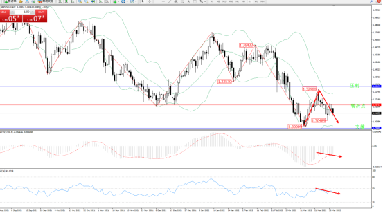 空头动力维持低位短期震荡上移后再度下挫,纠结于布林带指标通道中轨下侧弱势震荡,短期有继续下行态势,布林带指标呈收口走势喘息平移,前期低位1.30009位置近在咫尺,破位在即,上方压制关注1..33176附近,低位支撑关注1.29885附近,关注1.31717附近转折点,MACD指标处于0轴线下方空头区域维持整理平移,RSI指标处于50均衡线下侧弱势徘徊中,如图: