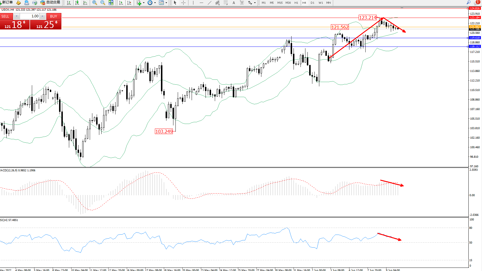 交易策略:121.562下方看跌,目标119.618、118.112