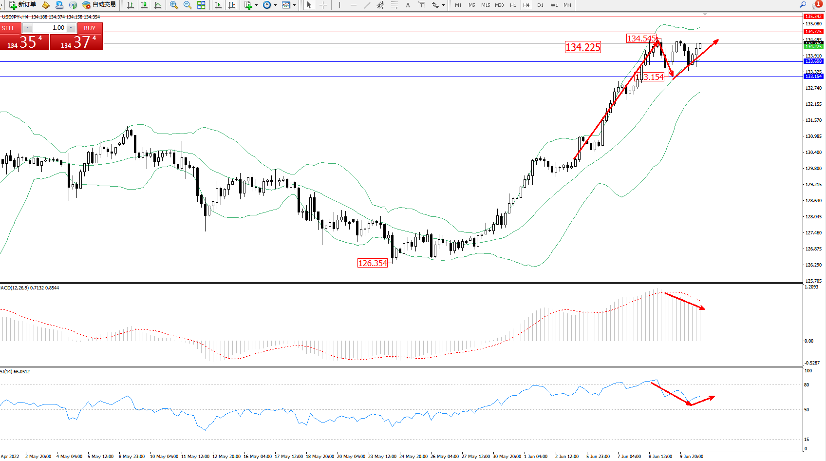 技术点评:多头动力延续布林带指标通道中上轨区间持续震荡上扬,高位抵达134.545附近节点后震荡,短期或维持高位窄幅整理,多头动力依旧有进一步上扬态势,布林带指标呈上行趋势走势良好,高位开始收口,MACD指标处于多头区域高位维持震荡回撤,RSI指标处于多头区域维持整理中;