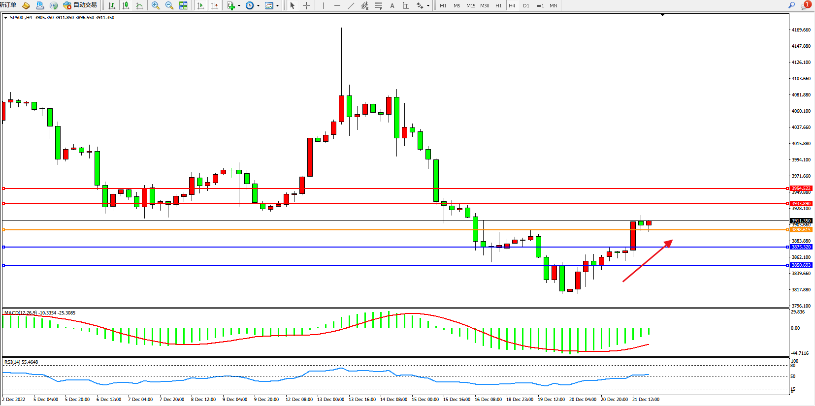 标普500指数12月21日(周三)收盘上涨56.68点,涨幅1.48%,报3878.30点;美国12月谘商会消费者信心指数:在经历了连续几个月的下滑后,在12月份有所上升。该指数目前为108.3,比11月的100.2相比大幅上升。这表明12月消费者信心有所反弹,达到2022年4月以来的最高水平。