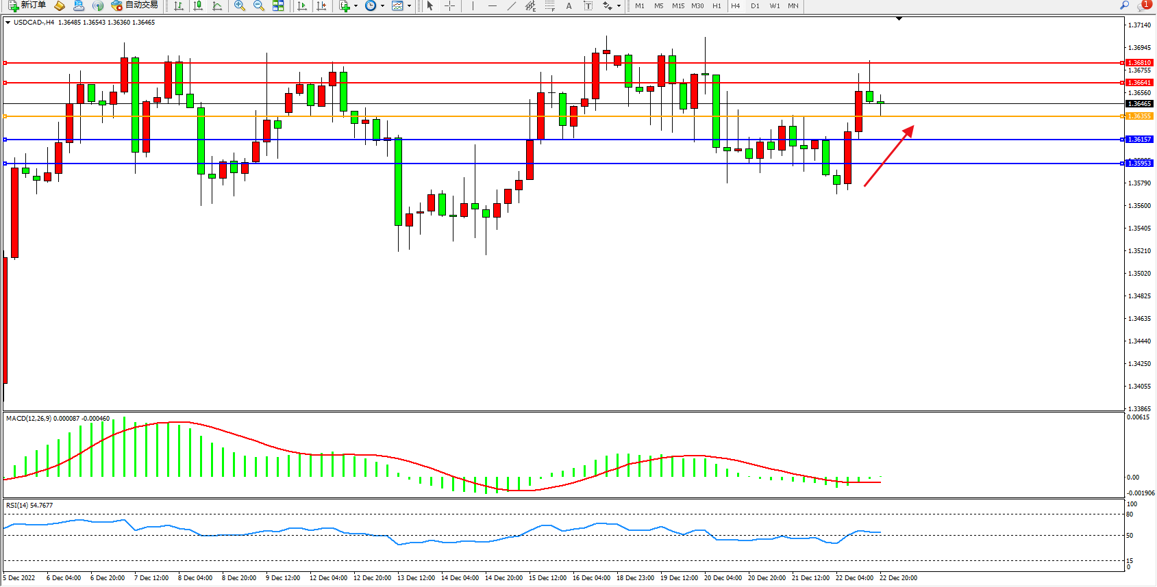 美元加元USDCAD——4小时K线图显示: