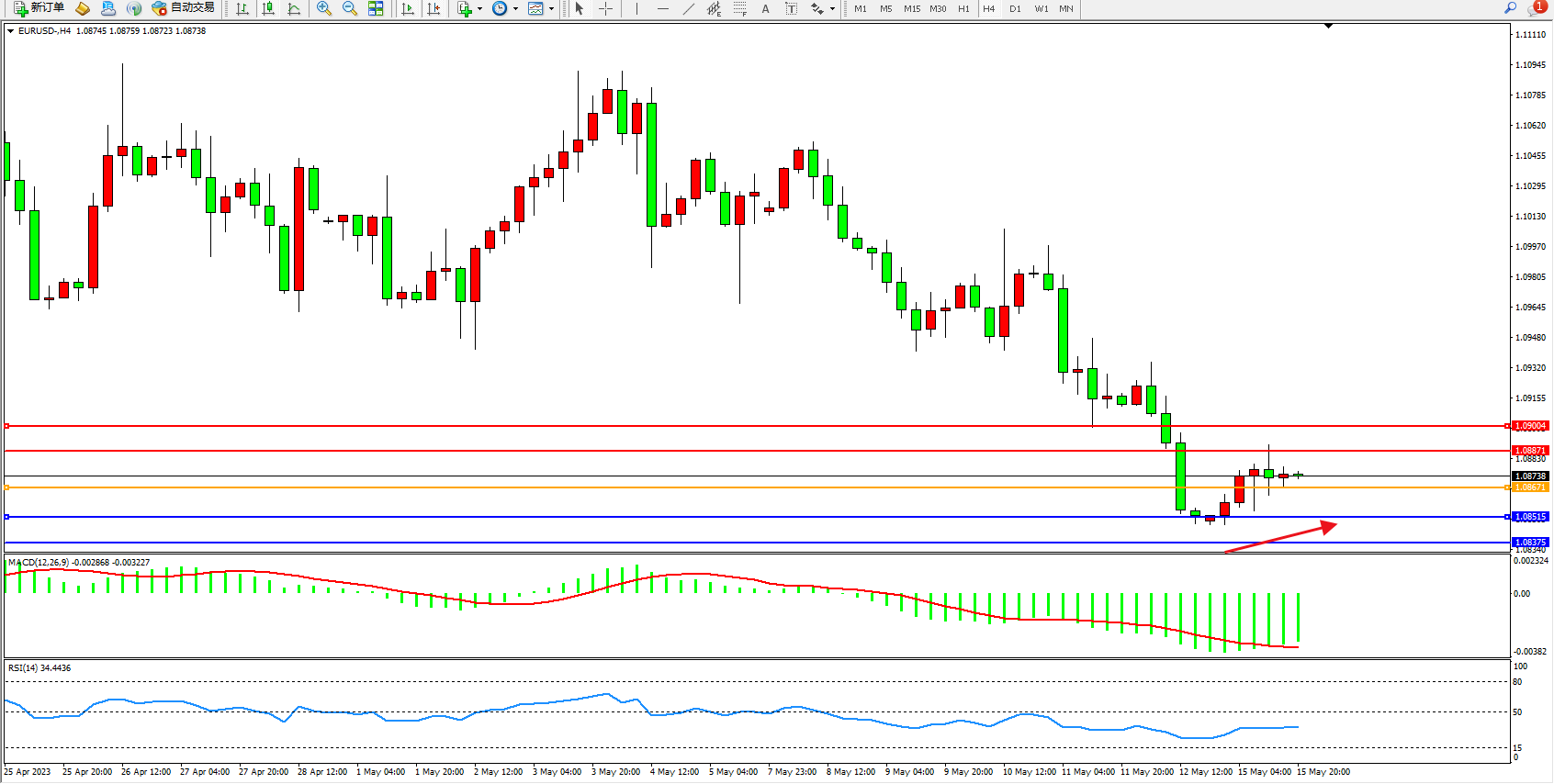 欧元美元EURUSD—4小时K线图显示: