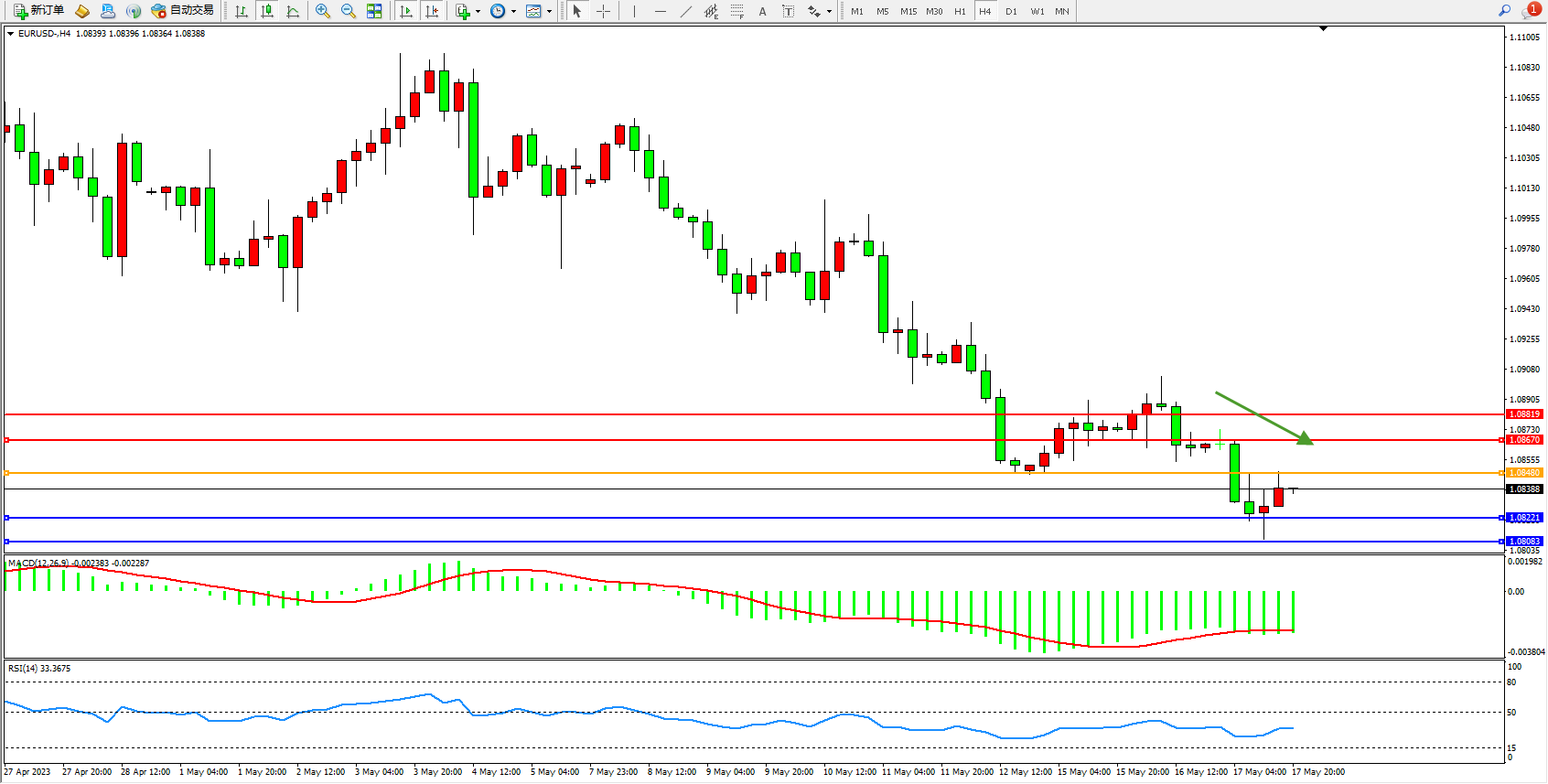 欧元美元EURUSD—4小时K线图显示: