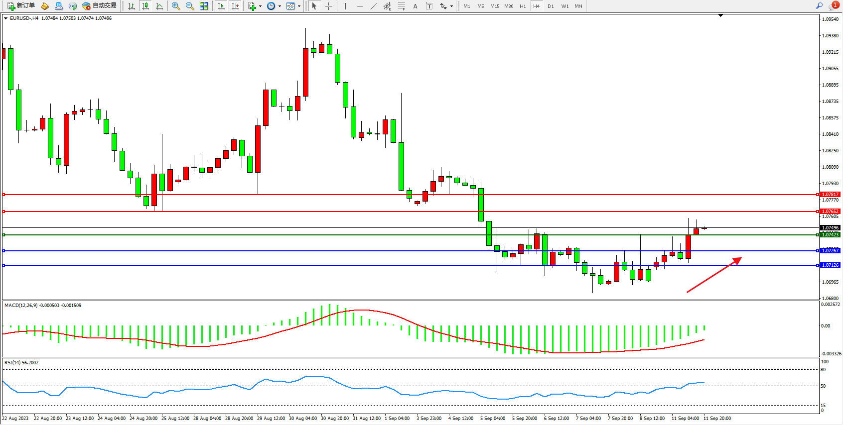 欧元美元EURUSD—4小时K线图显示: